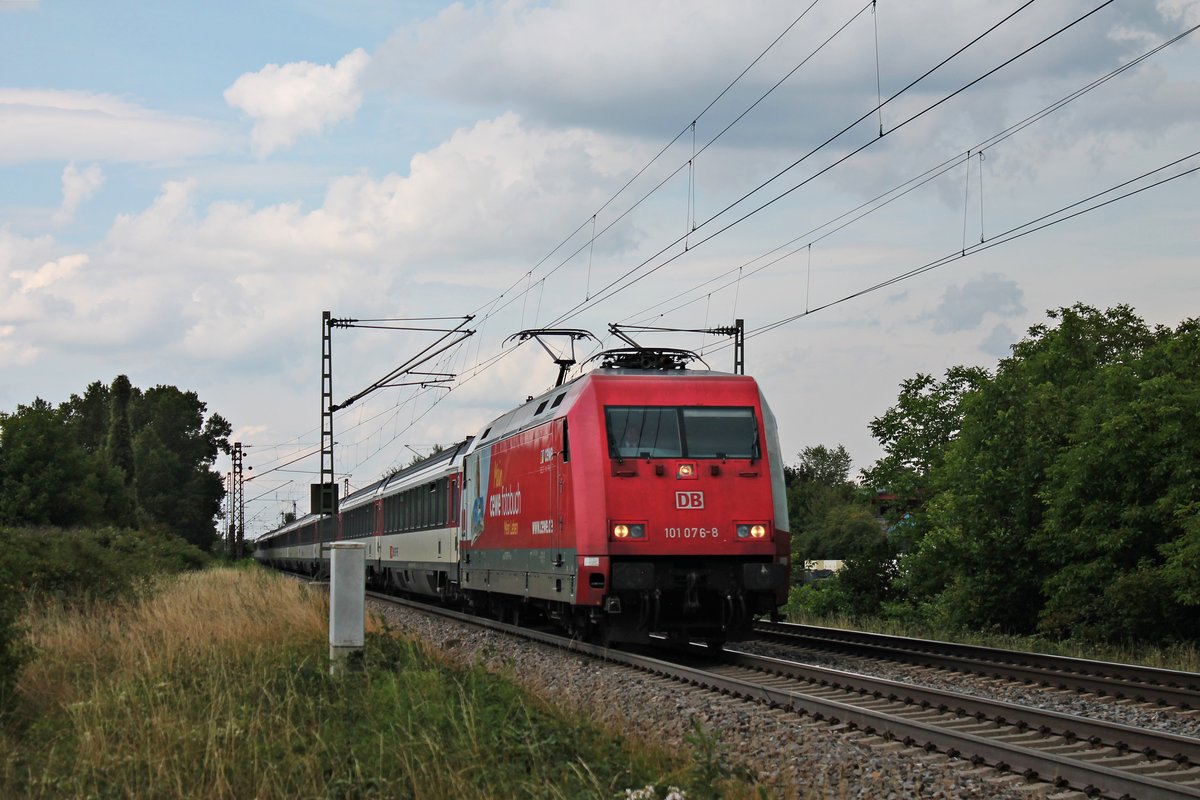 Mit dem EC 9 (Hamburg Altona - Zürich HB) war am 22.07.2017 die 101 076-8  CEWE Fotobuch  von Hamburg bis in die Schweiz nach Basel SBB unterwegs, wo sie ihren Zug an die SBB übergeben wird. Hier ist sie bei Buggingen unterwegs und hatte nur noch wenige Kilometer vor sich.