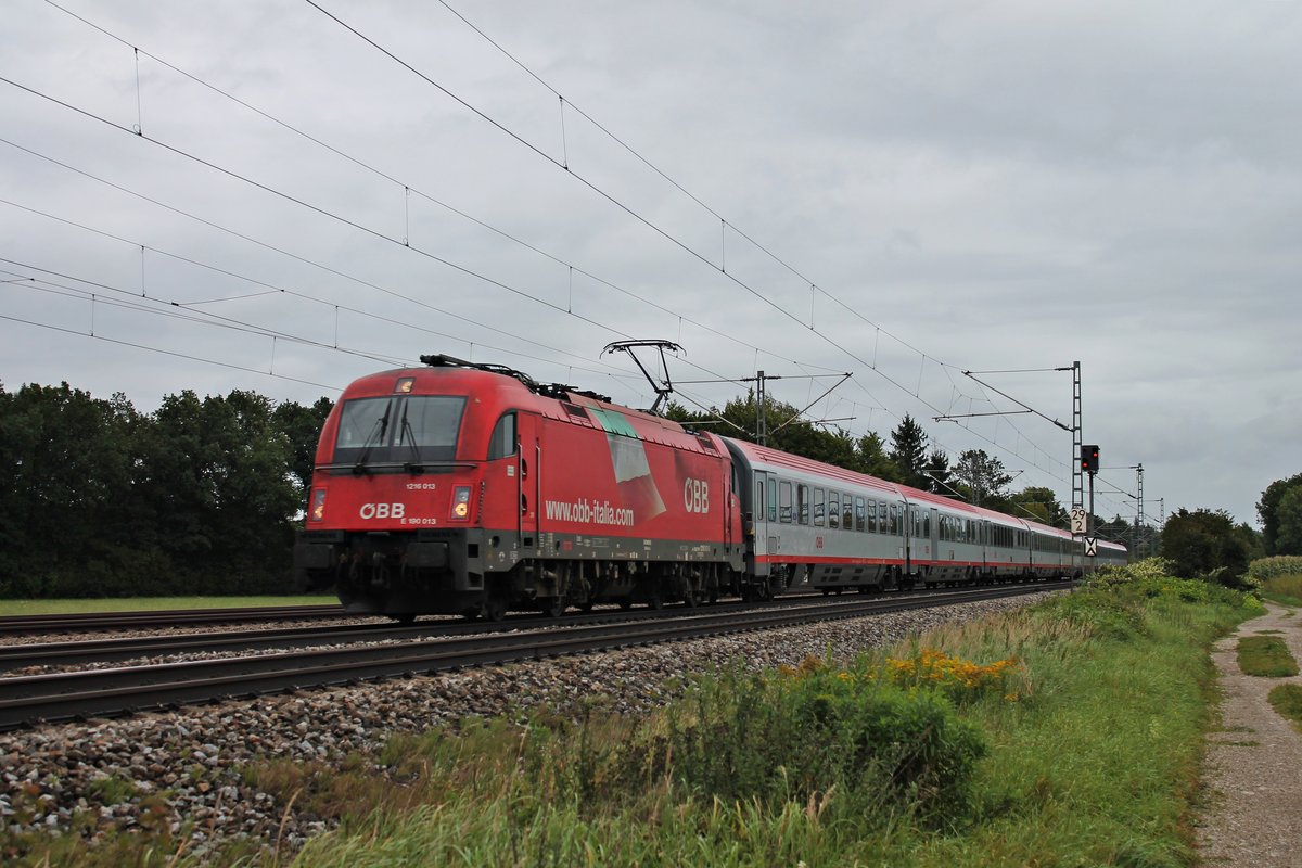 Mit einem EuroCity von Italien nach München fuhr am Mittag des 12.09.2017 die 1216 013 bei Zorneding in Richtung Zielbahnhof.
