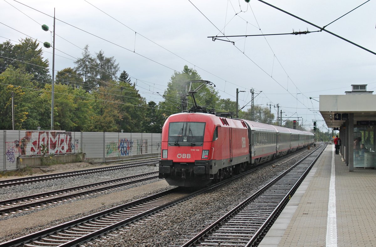 Nachschuss auf 1116 138 (ex. Heeressport) am 12.09.2017 bei Regen, als diese am Zugschluss vom EC 112 (Klagenfurt Hbf - Frankfurt (Main) Hbf), welcher von der 1016 042 geführt wurde, durch den Bahnhof von Zorneding gen München Ost fuhr.
