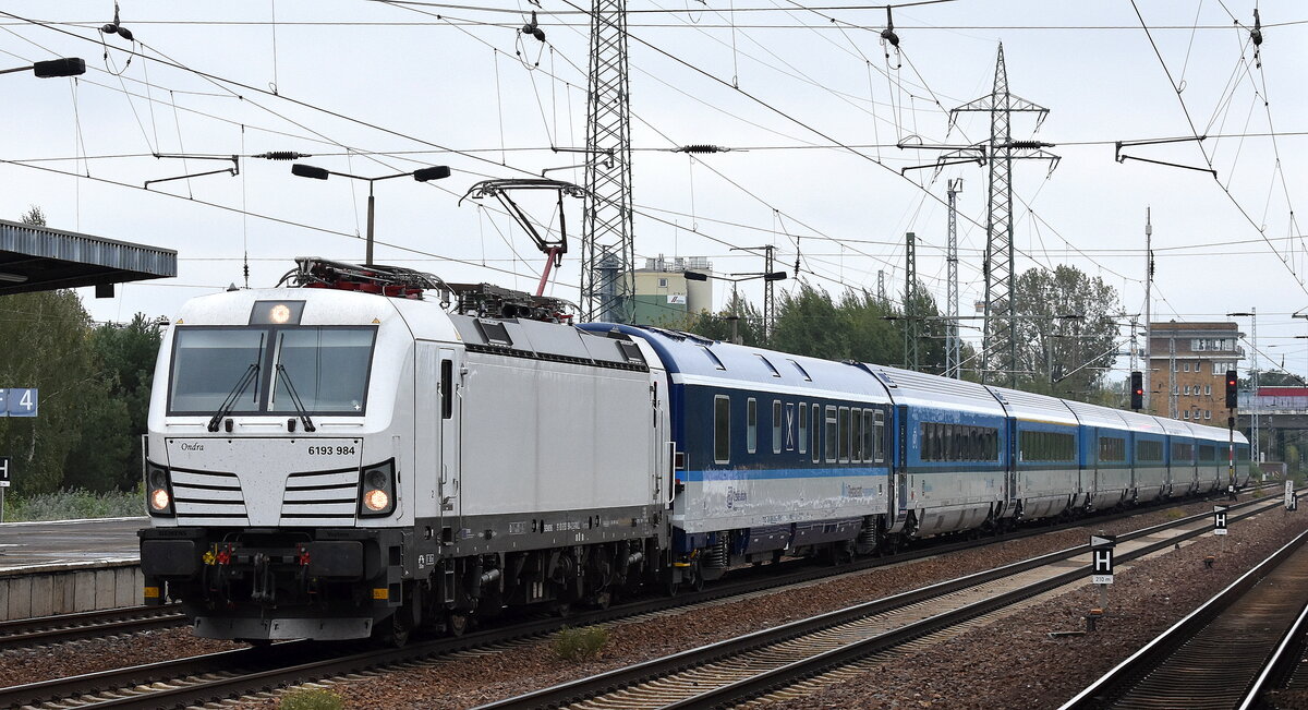 ČD - České dráhy a.s., Praha [CZ] mit der Vectron "6193 984", Name: "Ondra" [NVR-Nummer: 91 80 6193 984-2 D-RAILL] und EC Richtung Prag am 01.10.24 Höhe Bahnhof Schönefeld b. Berlin. Lothar Stöckmann