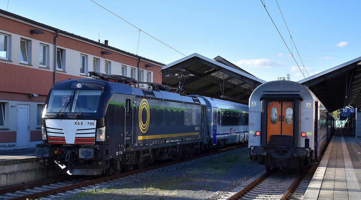 DB Fernverkehr AG [D] mit der BRCE Vectron "X4 E - 795" [NVR-Nummer: 91 80 6193 795-2 D-DISPO] und dem EC 49 Berlin-Warszawa-Express mit ewiger Verspätung wegen technischer Probleme stand erstmal lange Zeit im Bahnhof Frankfurt/Oder, 30.09.24 Lothar Stöckmann