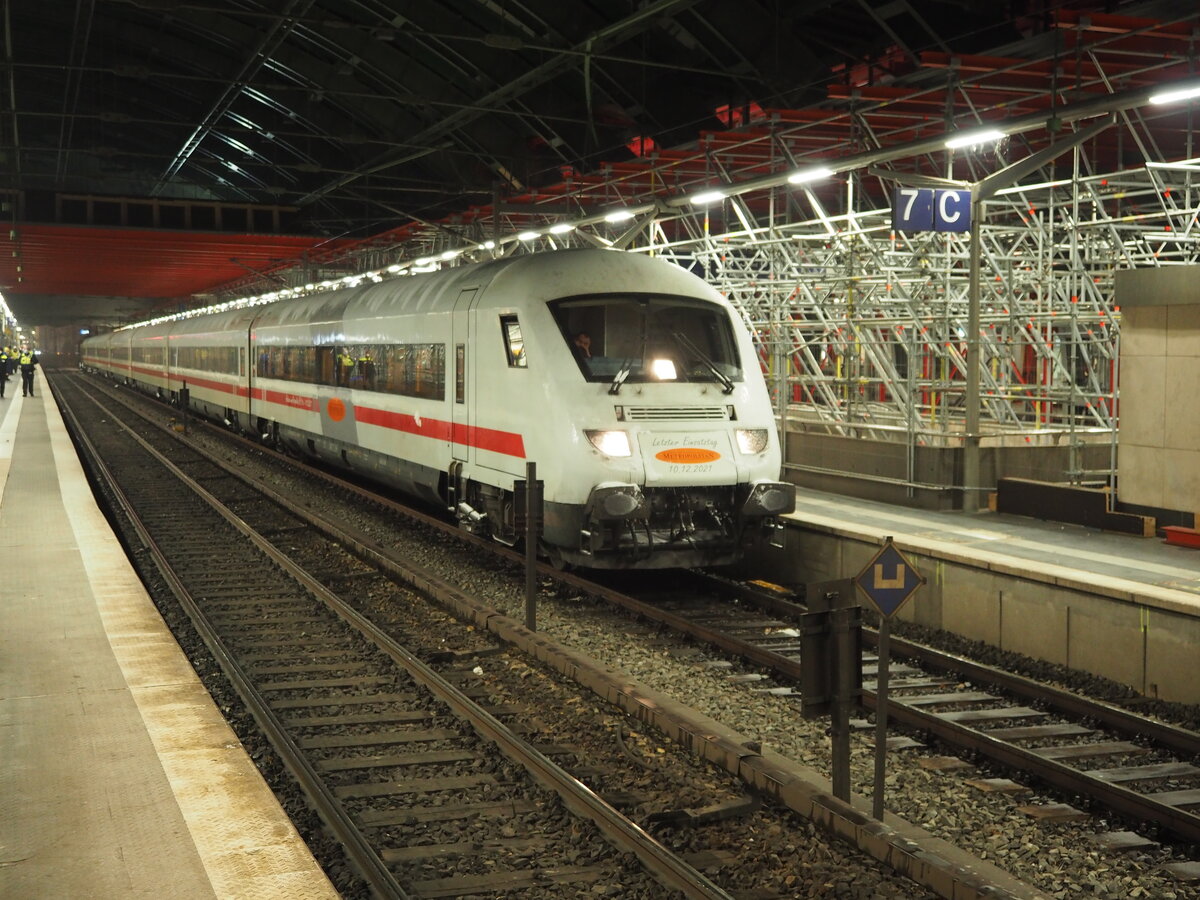 Die aus diesem Anlass beklebte ex-Metropolitan-Garnitur unternimmt mit 101 130-3 die letzte reguläre Fahrt als ICE 1051 nach Berlin (Hamm Hbf, 10.12.2021)