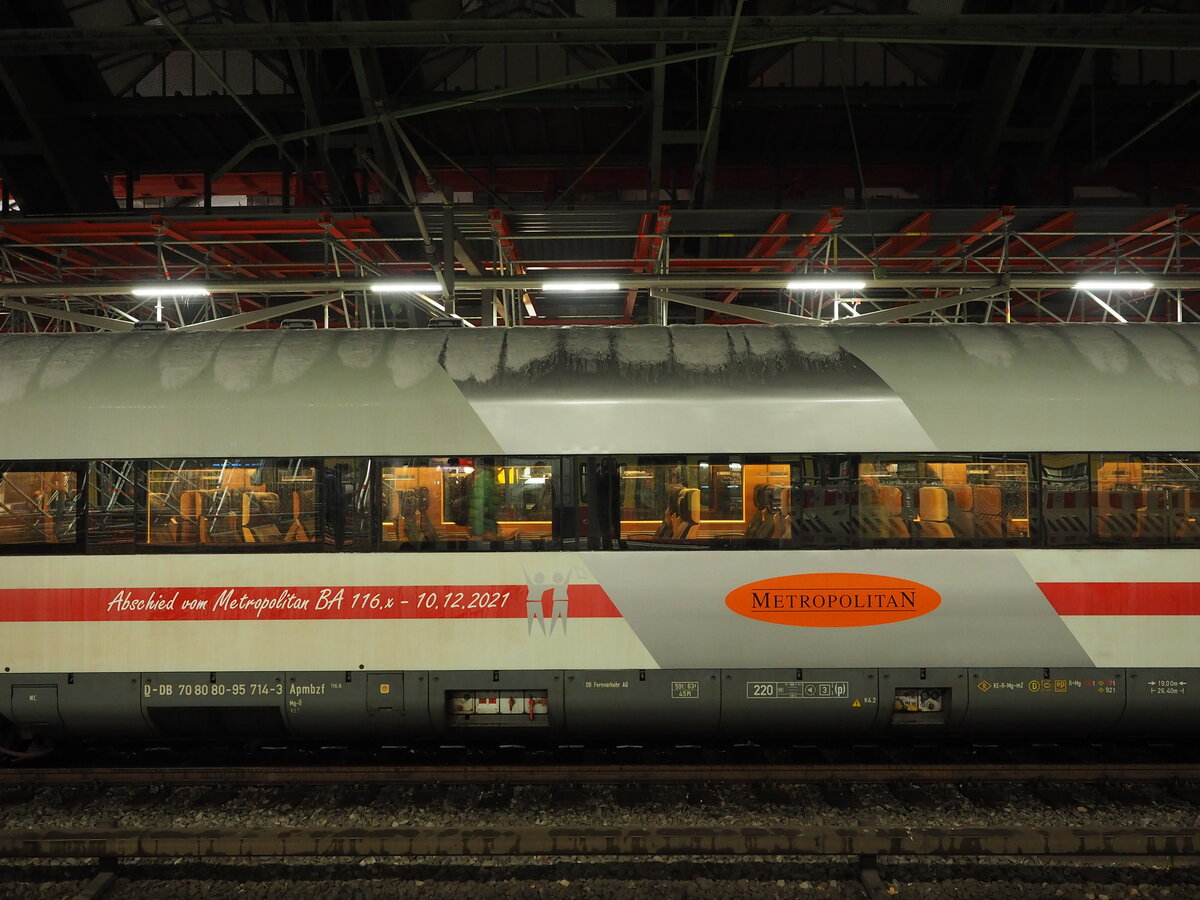 Nach 22 Jahren heißt es Abschied nehmen vom einstiegen Luxus Zug der DB. 1999 als Metropolitan und reiner erste Klasse fuhr er ab 2004 als ICE. In all den Jahren hob er dich vom Komfort deutlich hervor. Zum letzten Betriebstag am 10.12.21 hat man dem ex Metropolitan noch einmal seine alten Logos foliert. Berlin 10.12.2021