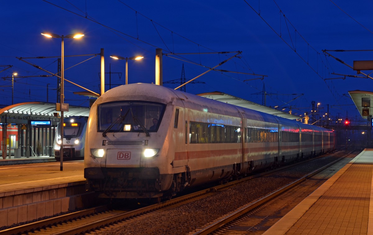 Der als ICE 1005 verkehrende Metropolitan wartet am Morgen des 16.12.14 in Bitterfeld auf die Abfahrt Richtung Halle(S).