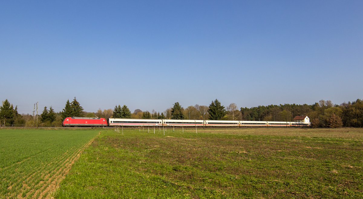 101 130-3 schiebt am 21. April 2014 eine ehemalige Metropolitan Garnitur der DB als IC nach Berlin hier auf der KBS 203 (Stralsund - Berlin - Elsterwerda) bei Diedersdorf.