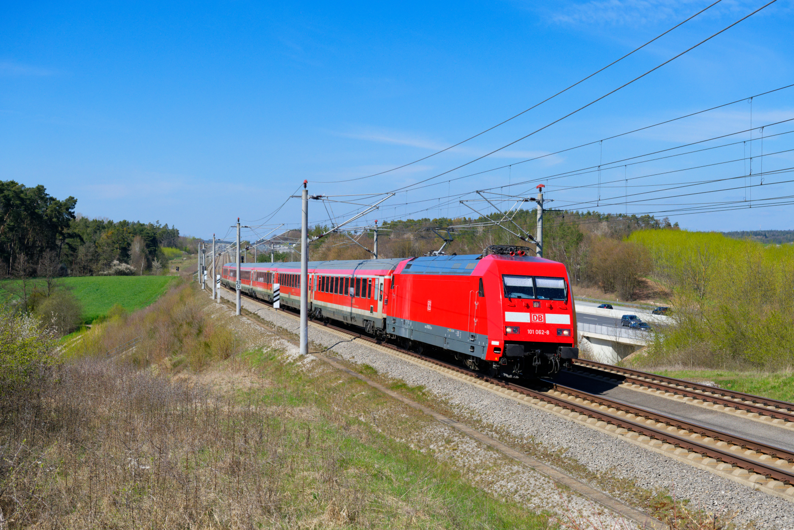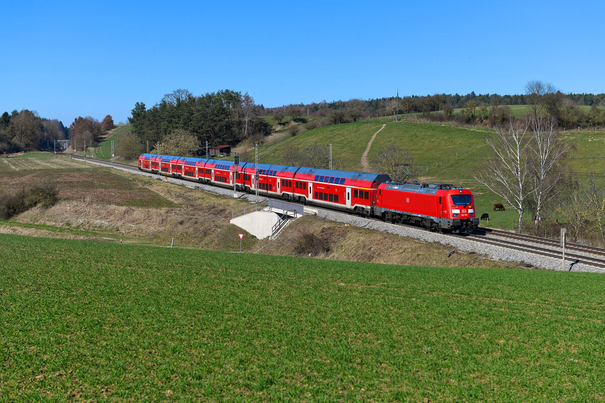 Seit einigen Monaten verkehrt die Linie RE 1 zwischen München und Nürnberg häufiger. Da allerdings Fahrzeuge für die Fahrt auf der Neubaustrecke fehlen, werden hier Twindexx-Triebzüge eingesetzt, die den Weg über das Altmühltal und Treuchtlingen nehmen. Hierbei wird ab Ingolstadt praktisch ohne Halt durchgefahren, nur in Roth wird ein Zwischenstopp eingelegt. Am 06. April 2024 konnte ich den 445 101 auf seiner Fahrt als RE 57876 nach Nürnberg Hbf kurz nach Verlassen des Esslinger Eisenbahntunnels fotografieren. Christoph Schneider