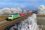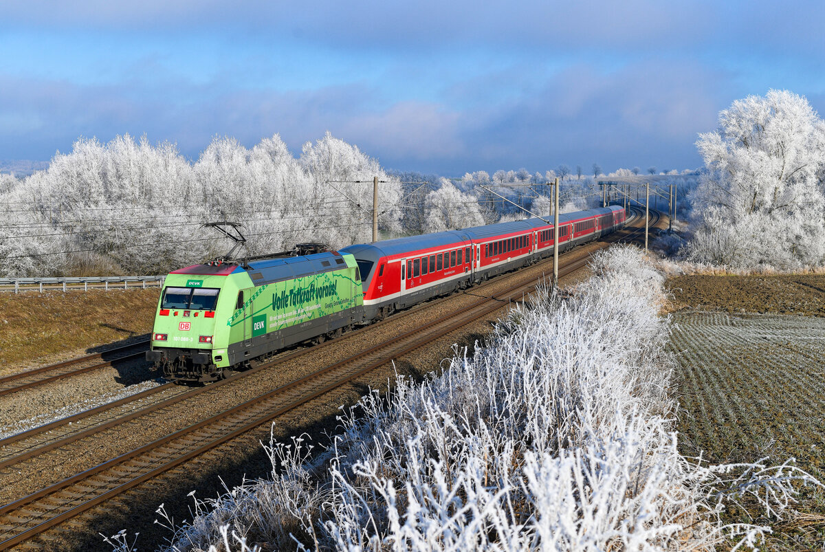 Seit dem Fahrplanwechsel kommt auf dem München-Nürnberg-Express wieder eine Lok der Baureihe 101 von DB Fernverkehr zum Einsatz. Als Reserve für die chronisch unzuverlässigen Skoda-Doppelstock-Garnituren wird diese nun mit druckertüchtigten IC 1 Wagen verwendet. Es wird hierbei mit sechs zuvor in den Werken Neumünster und Wittenberge überholten Waggons gefahren, mit je einem Steuerwagen an der Spitze und am Ende. So ergibt sich wieder ein jahrelang vertrautes Bild auf der KBS 900. Am 31. Dezember 2024 gab es eine sehr interessante Wettersituation im Dachauer Hinterland. Am Vortag war es recht warm und feucht, in der Nacht frostig. Als Ergebnis war die Landschaft mit einer dicken Schicht Raureif überzogen. Bei der Durchfahrt der für die Versicherung DEVK werbende 101 088 mit dem RE 4019 hatte sich die Wolkendecke auch rechtzeitig gelichtet. Christoph Schneider
