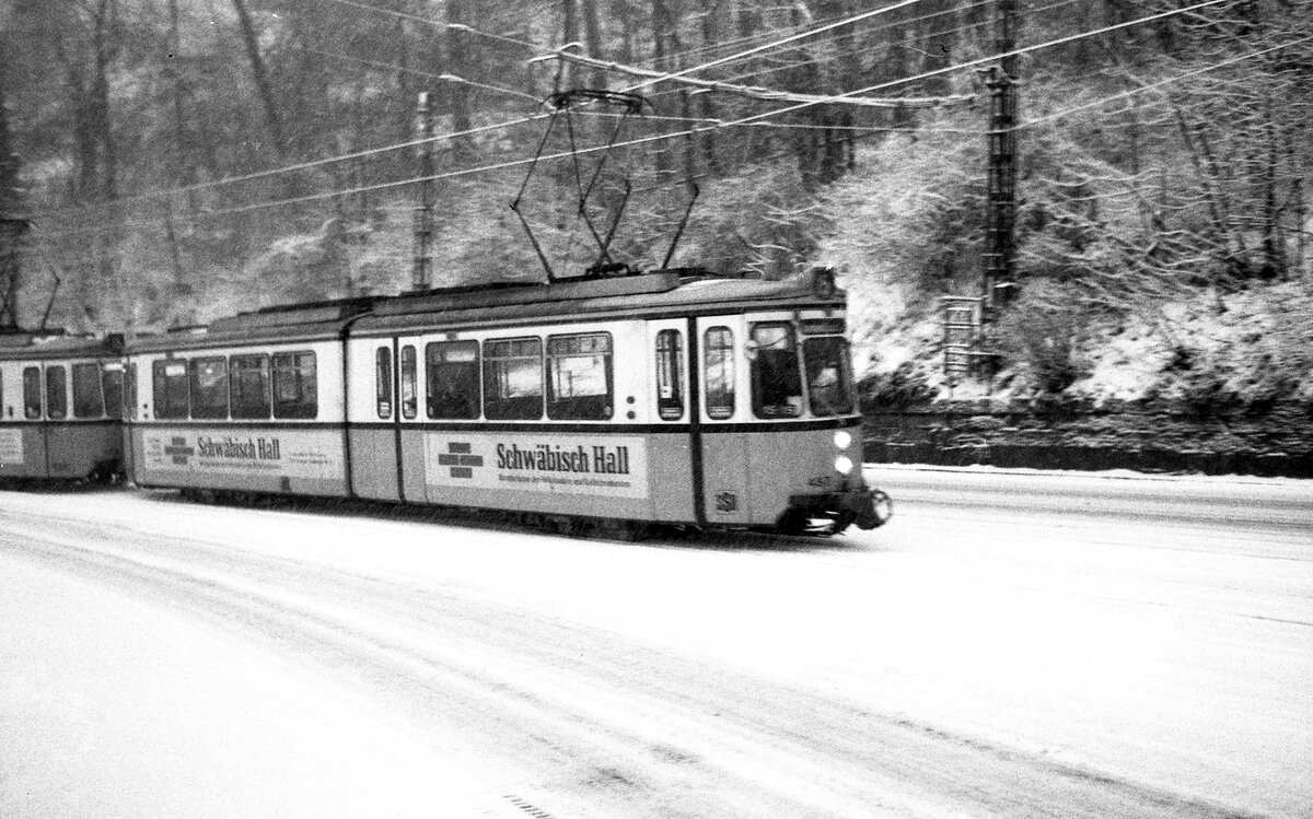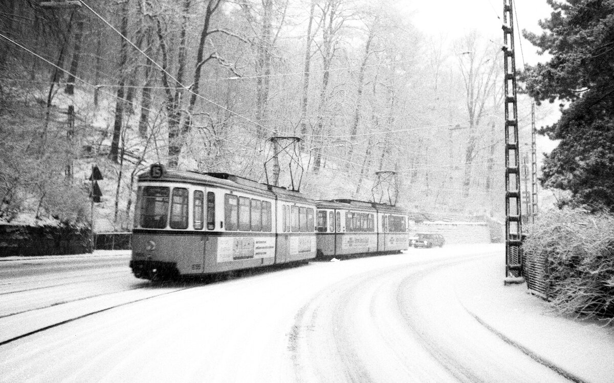 SSB Stuttgart__Verschwundene Strecken__Linie 15 mit GT4 599 als BTw auf der Neuen Weinsteige kurz vor der Haltestelle 'Altenbergstaffel'. Im Wald rechts, ca. 12 Meter oberhalb der Neuen Weinsteige ist seit 1987 die "Fenstertrasse" in Betrieb. (Linie 15 verkehrte von 01.10.1978 bis 22.05.1982 nach Degerloch (HVZ Möhringen).__06-01-1981 Klaus-Erich Lisk