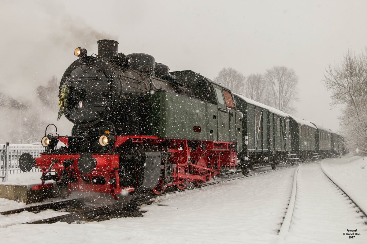 Um ein paar ICEs oder Hamster im Schnee zu fotografieren bin ich mit dem Rad an die KBS 580 gefahren. Als ich gerade nach einer guten Stelle gesucht habe, traute ich meinen Ohren nicht: Ein lautes Dampflokpfeifen war zu hören und wenige Augenblicke später war sie dann auch da... Das nennt man Fotografenglück, hatte ich doch eigentlich gar nicht mit einem Dampfzug gerechnet. Später erfuhr ich, dass es 41 1144 mit einem Sonerzug von Greiz nach Eisenach war.