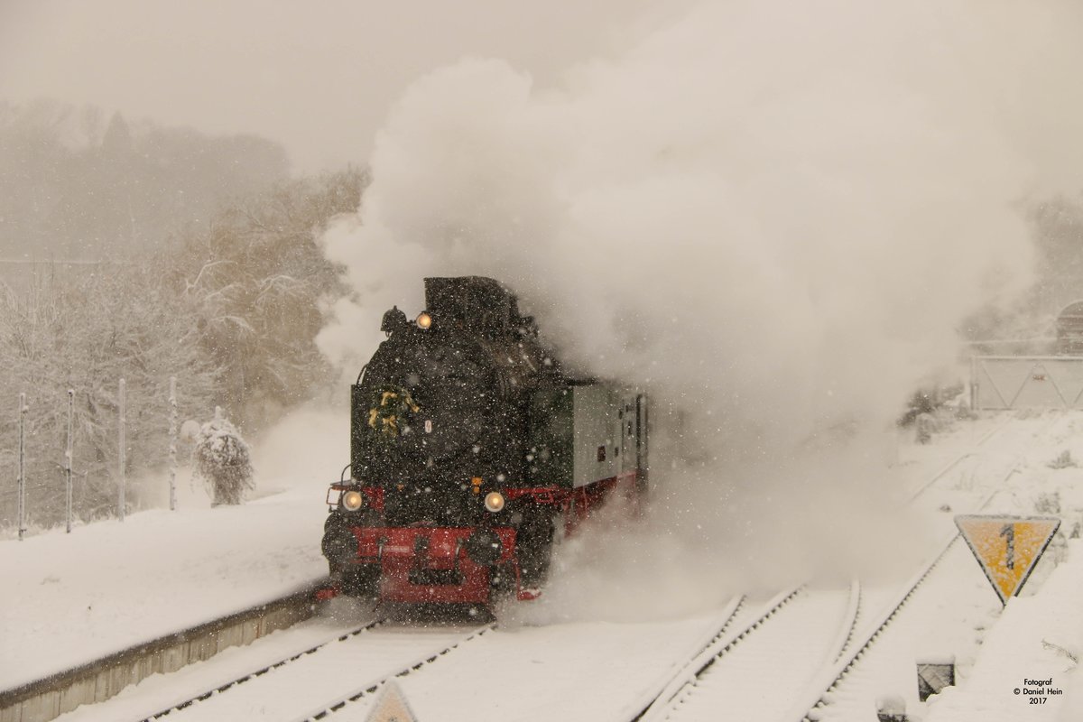 Um ein paar ICEs oder Hamster im Schnee zu fotografieren bin ich mit dem Rad an die KBS 580 gefahren. Als ich gerade nach einer guten Stelle gesucht habe, traute ich meinen Ohren nicht: Ein lautes Dampflokpfeifen war zu hören und wenige Augenblicke später war sie dann auch da... Das nennt man Fotografenglück, hatte ich doch eigentlich gar nicht mit einem Dampfzug gerechnet. Später erfuhr ich, dass es 41 1144 mit einem Sonerzug von Greiz nach Eisenach war. Neudietendorf, 03. Dezember 2017