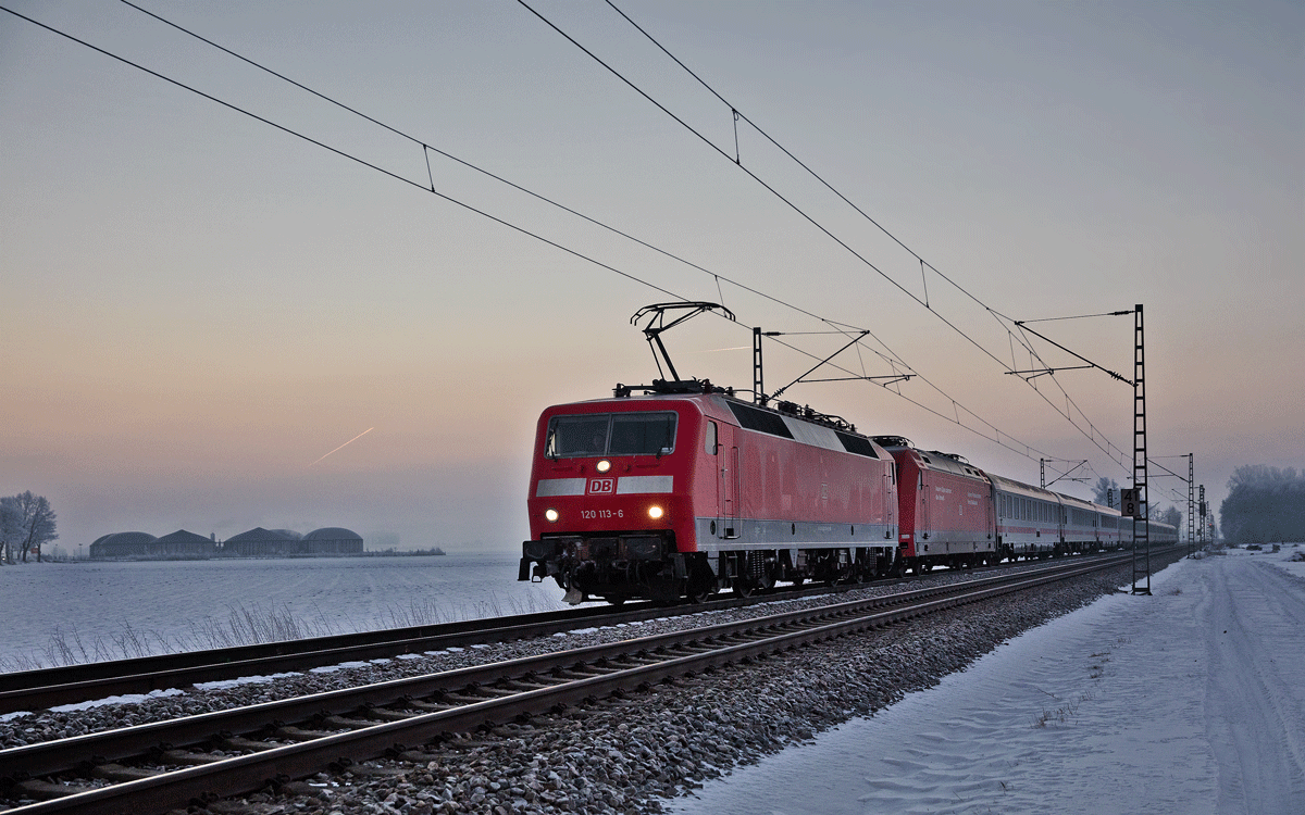 Vor Sonnenaufgang braust in Front einer Doppeltraktion die 120 113-6 mit dem IC 2024 von Passau Hbf nach Hamburg-Altona in Langenisarhofen vorüber.Bild vom 20.1.2017