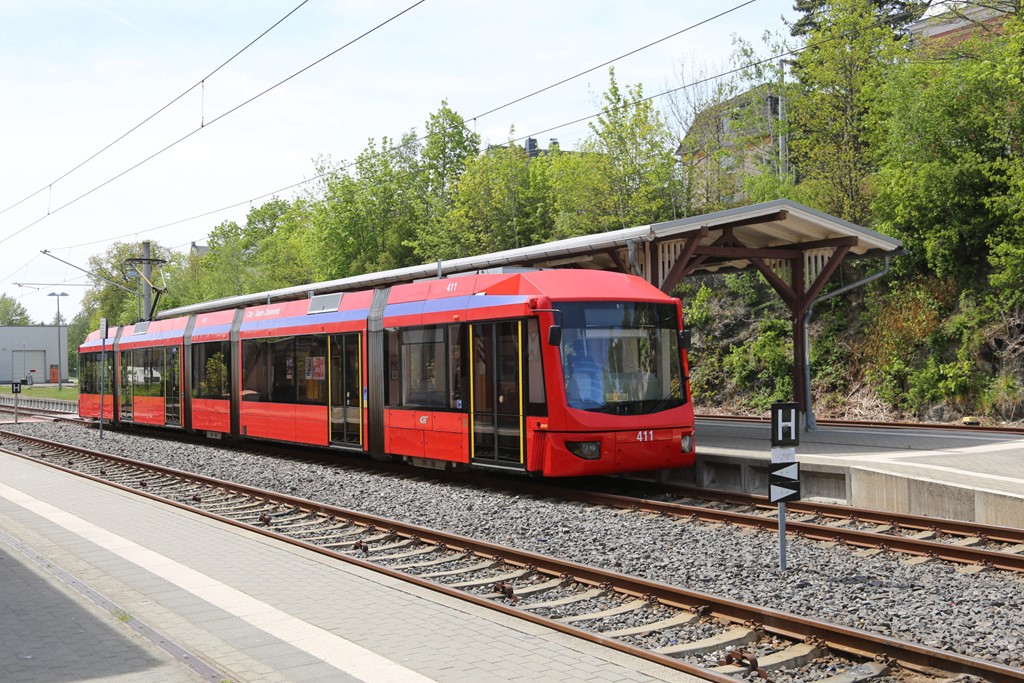 Betriebspause in Stollberg in Sachsen am 1.5.2024. Der ET 411 der City Bahn Chemnitz stand geparkt am Bahnsteig. Es herrschte Schienen Ersatz Verkehr! Gerd Hahn