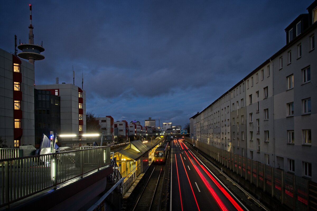 Haltestelle Savignystraße/ETEC auf der Linie U18 mit einem B-Wagen der Ruhrbahn (21.11.2021)