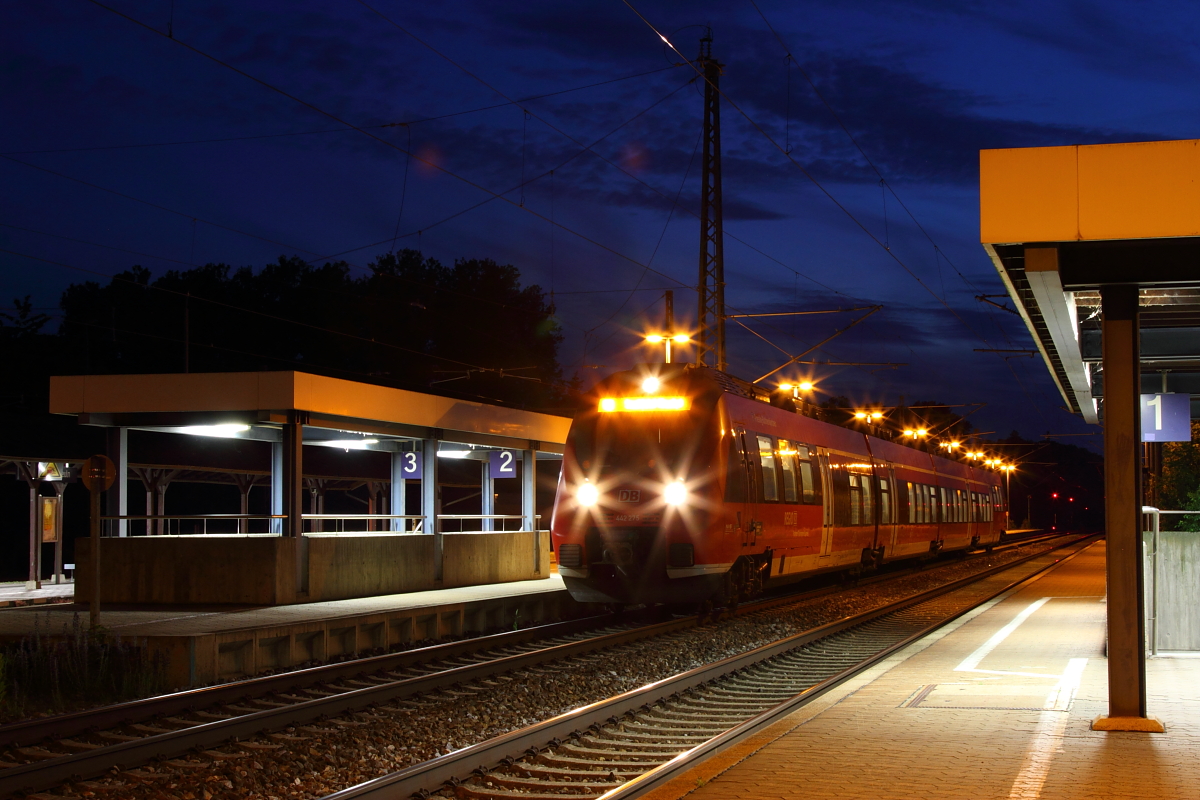 Bahnsteigbild des Tanlent 643 712 in Herzogenrath  der Euregiobahn RB 20 nach Eschweiler - St.- Jöris. Aufnahme am 21.2.2016,  25 Sekunden belichtet in der Blauenstunde