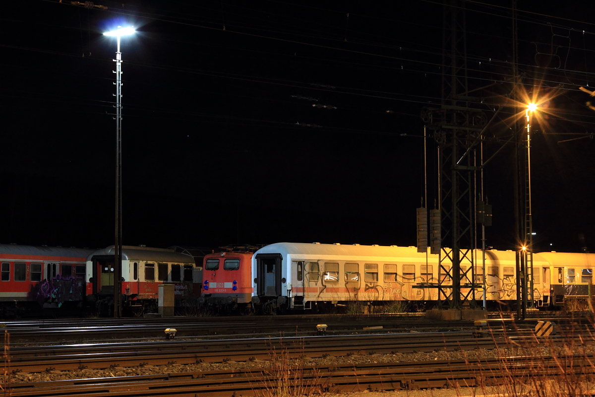 Abgestellte Wagen und die 110 223-5 im Lichtenfelser Bahnhof am 29.03.2016.