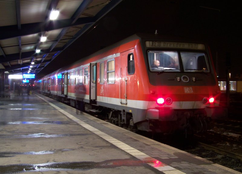 Hier sieht man den RE18(RE 38514), welche gerade aus Dresden Hbf angekommen ist und sich wieder startklar macht für die Rücktour. Cottbus den 02.02.2009 Hannes Müller