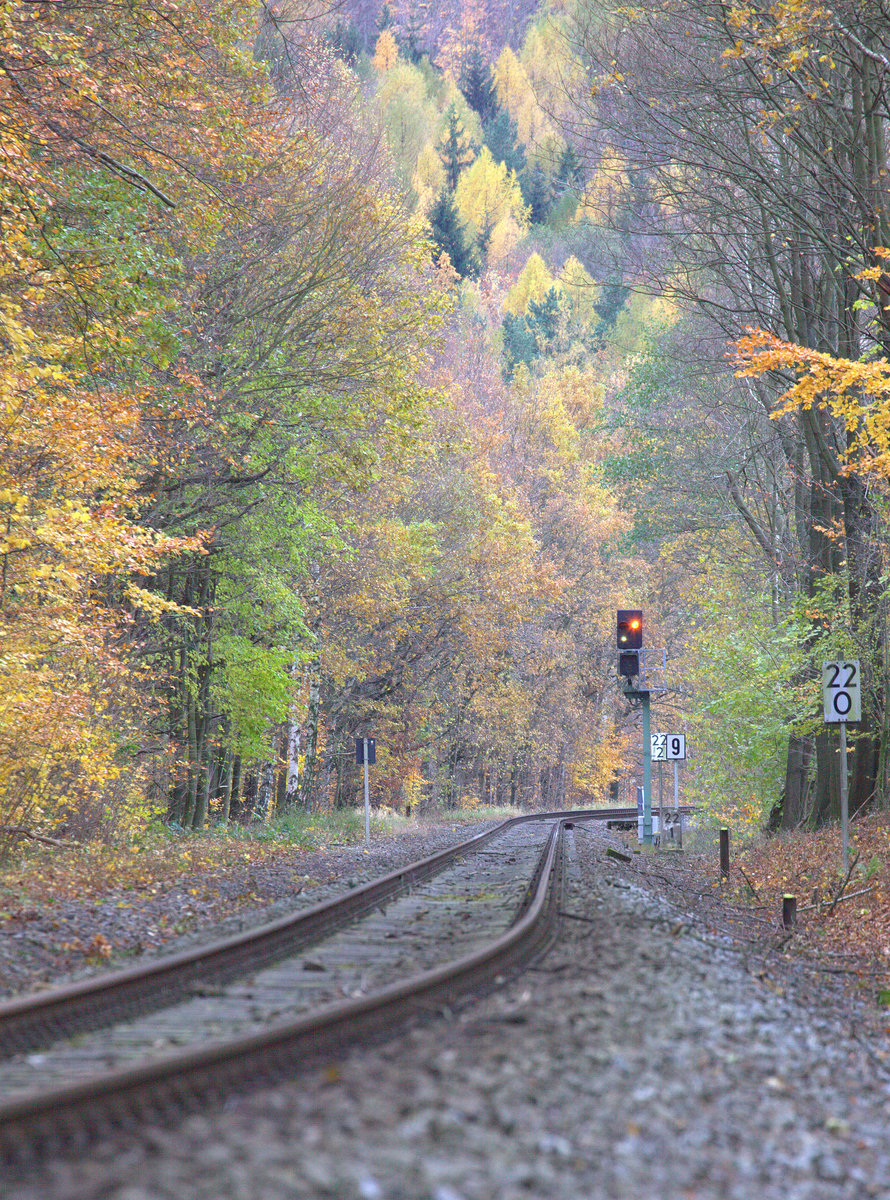 Auch in der Lausitz, hier die Doppelkurve vor Neukirch (Lausitz) West, zeigt sich der Herbst aktuell noch bunt.