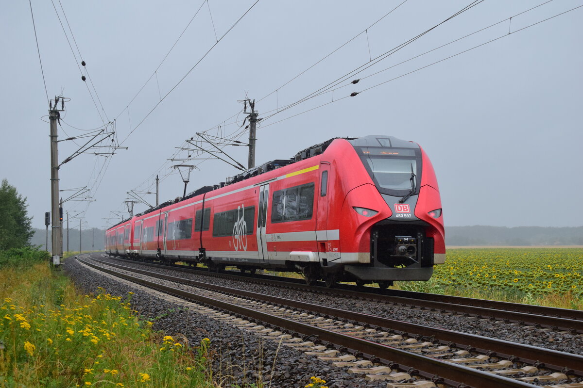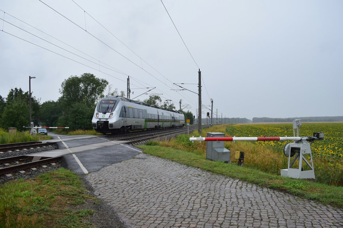 Nachschuss auf 1442 631 (Bombardier Talent 2), der den Hp Eilenburg Ost auf Gleis 5 erreicht.