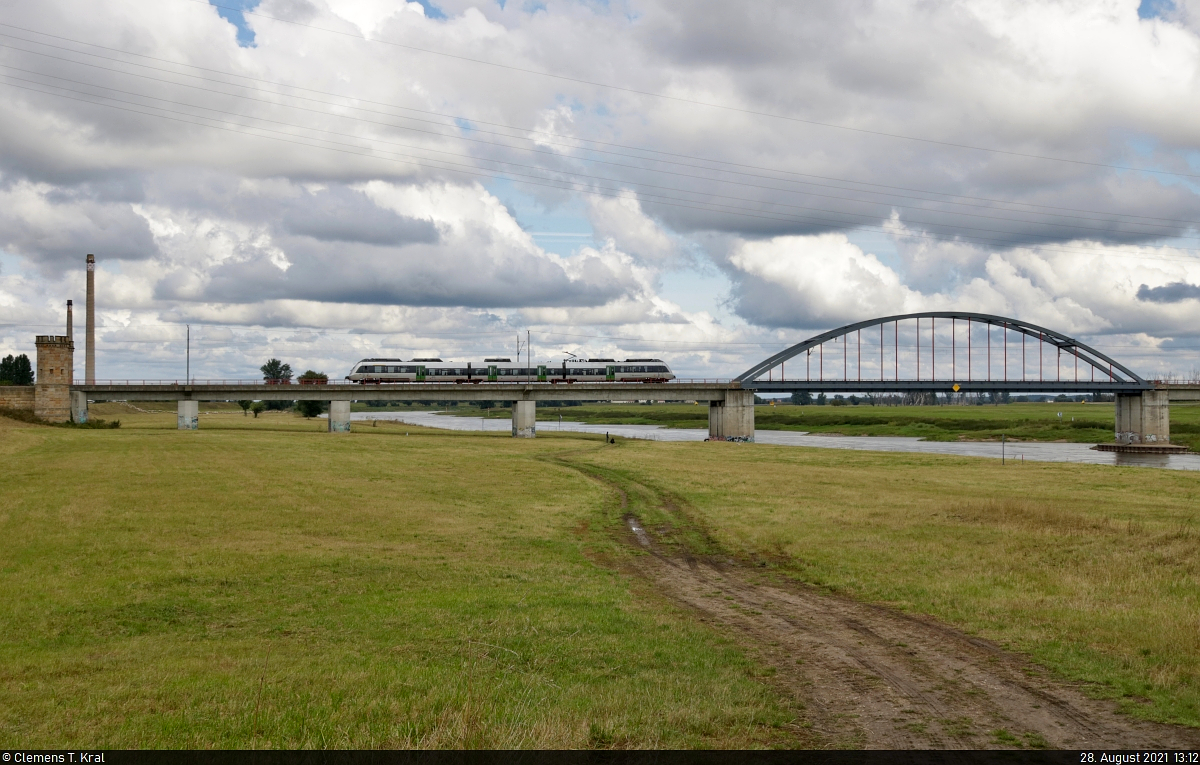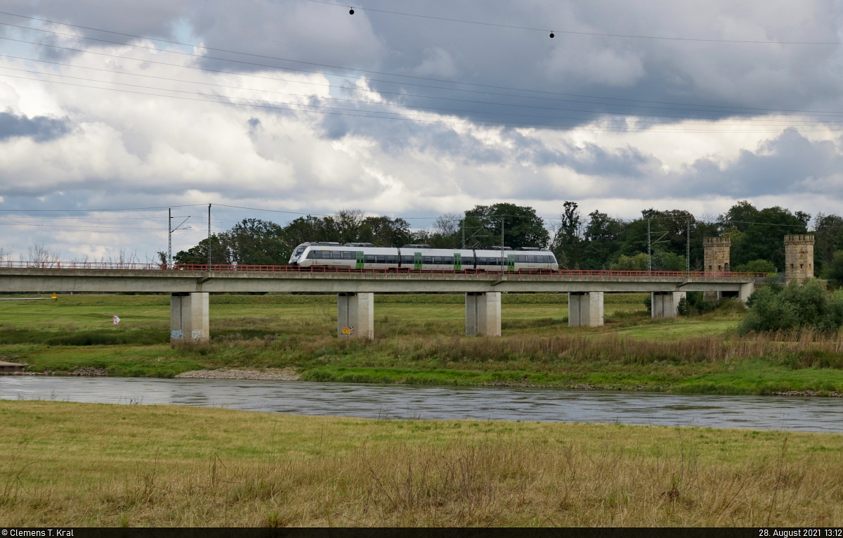 1442 114 (Bombardier Talent 2) hat die Elbe überquert und nimmt Kurs auf den Bahnhof Torgau.