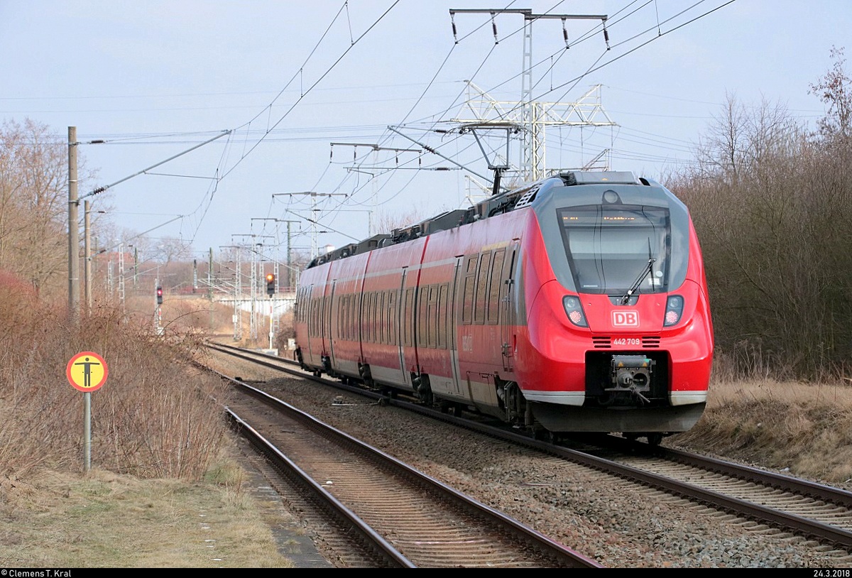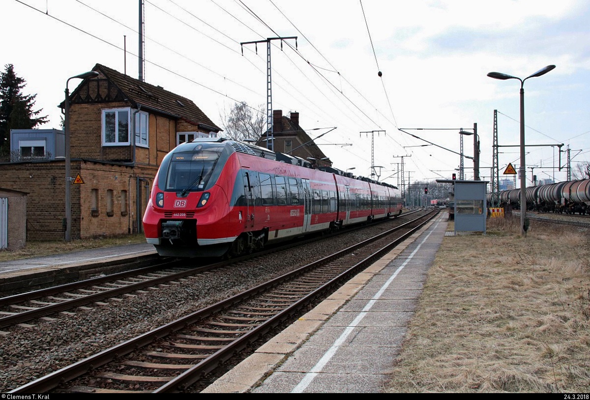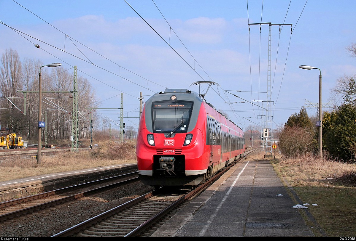 Nachschuss auf 442 709 (Bombardier Talent 2) von DB Regio Südost als RE 18391 (RE10) von Leipzig Hbf nach Cottbus, der den Bahnhof Leipzig-Thekla auf der Bahnstrecke Leipzig–Eilenburg (KBS 215) durchfährt. [24.3.2018 | 15:16 Uhr] Clemens Kral