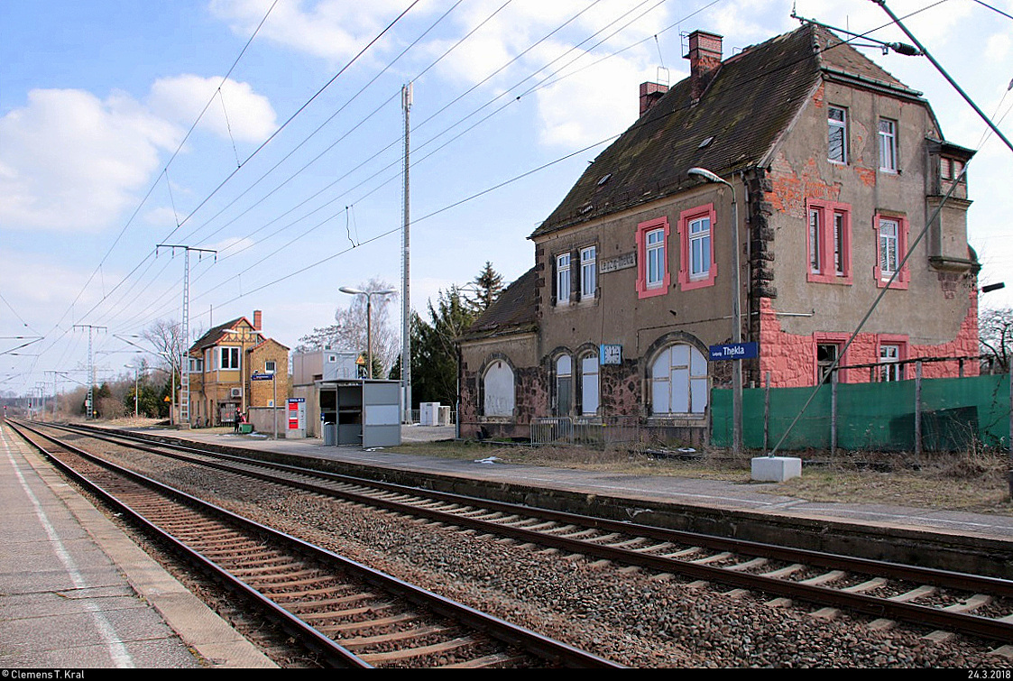 Blick auf die Anlagen des Bahnhofs Leipzig-Thekla auf der Bahnstrecke Leipzig–Eilenburg (KBS 215), mit altem Bahnhofsgebäude, (elektro-)mechanischem Stellwerk und neuem elektronischen Stellwerk. Aufgenommen von Bahnsteig 2, der nicht mehr genutzt, aber noch frei zugänglich ist. [24.3.2018 | 14:12 Uhr] Clemens Kral