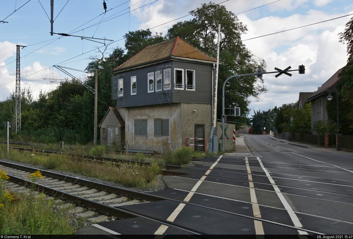 Das 1910 errichtete mechanische bzw. Gleisbild-Stellwerk "Mw" der Bauart Jüdel bzw. GS II DR für den Fahrdienstleiter im Bahnhof Mockrehna.