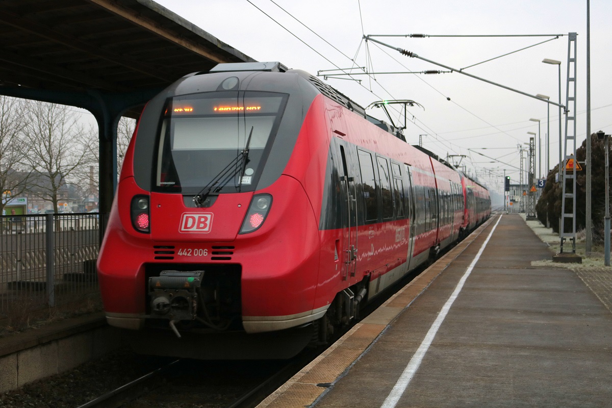 Nachschuss auf 442 006 und 442 210 (Bombardier Talent 2) von DB Regio Südost als RE 18386 (RE10) von Cottbus nach Leipzig Hbf, die den Bahnhof Doberlug-Kirchhain auf der Bahnstrecke Halle–Cottbus (KBS 215) verlassen. Bild durchlief die Selbstfreischaltung. [16.12.2017 | 9:45 Uhr] Clemens Kral