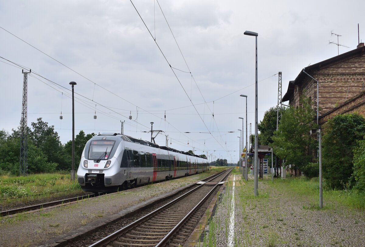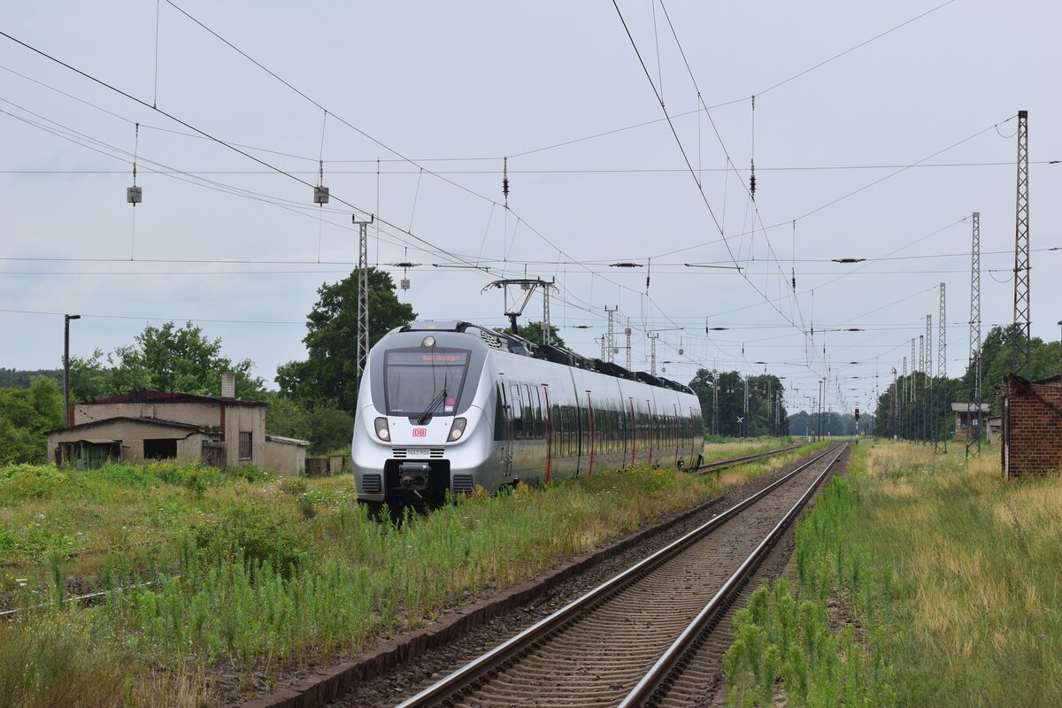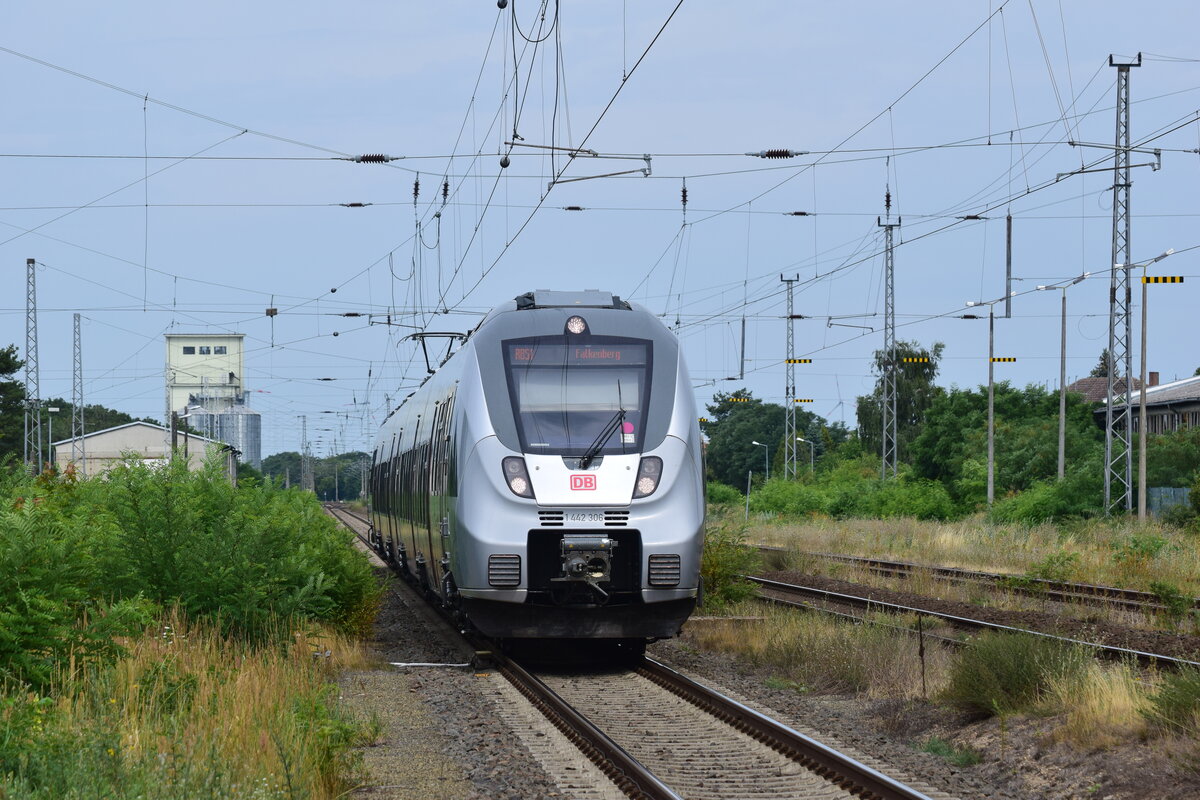 1442 304 fährt in Annaburg ein. Links und rechts der Gleise stehen noch alte Gebäude und Ruinen aus besseren Zeiten des Bahnhofs. Der Zug endet in Annaburg und fährt zum wenden nach Fermerswalde. Annaburg 27.07.2023