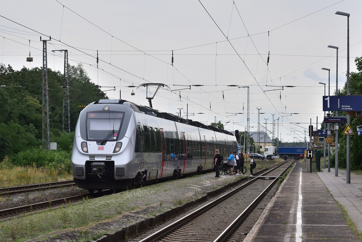 1442 307 fährt in Fermerswalde ein. Leider waren die Bahnsteige außerhalb der Ankünfte und Abfahrten nicht zugänglich so blieb nur ein Foto von der Straßenbrücke. Fermerswalde 21.09.2024