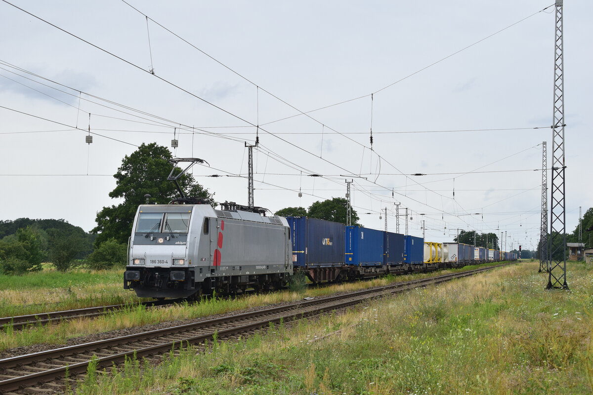 186 360-4 fährt mit einem Containerzug durch Annaburg in Richtung Falkenberg. Annaburg 27.07.2023