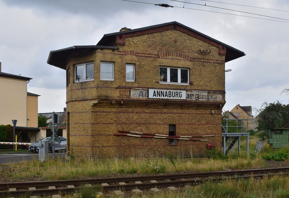 Blick auf das Stellwerk As in Annaburg. Das Stellwerk wurde 1943 mit der Bauform Einheit Mechanisch mit Wechselstromblock in Betrieb genommen. Vermutlich mit der Elektrifizierung wurde der Bahnhof auf Hl Signale umgerüstet und das Stellwerk auf GS II DR umgebaut. Das Stellwerk war bis ungefähr 2006 das Wärterstellwerk in Annaburg und wurde dann zum Fahrdienstleiterstellwerk umgebaut und das andere Stellwerk An wurde außer Betrieb genommen. Bis in die 90er Jahre steuerte As zusätzlich die Ausfahrt auf die 1996 stillgelegte Strecke nach Prettin. 2022/2023 wurde dann der alte WSSB BÜ durch eine moderne BUES2000 Anlage ersetzt. Interessant sind hierbei auch die rot weiß markierten Holzstäbe am Stellwerk.  Vielleicht kennt jemand die Funktion oder den Nutzen dieser Holzstäbe?