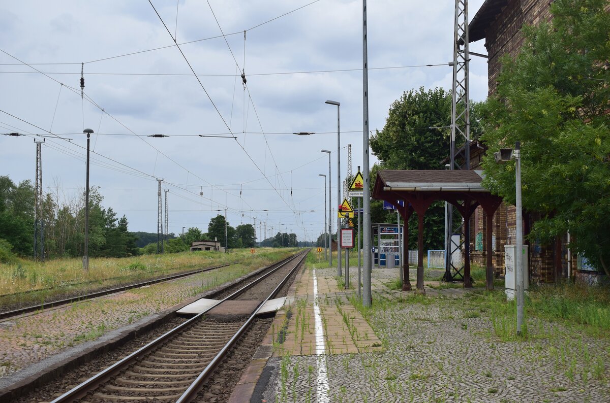 Blick vom Bahnübergang in Richtung Jessen auf die Bahnsteige. Links sieht man die ehemaligen Gütergleise bzw Überholgleise welche heute gekappt und stillgelegt sind. Annaburg 27.07.2023