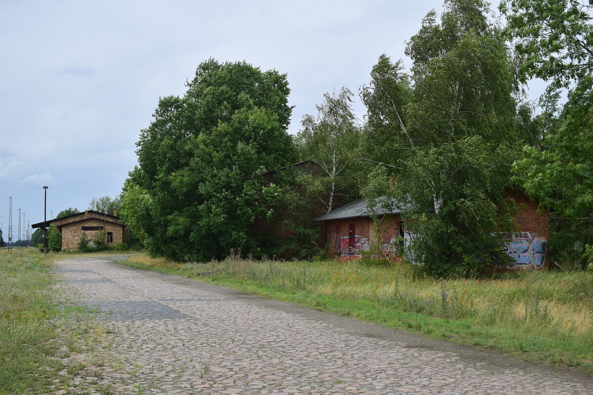 In Annaburg finden sich noch unzählige Relikte aus besseren Zeiten. Hier ein Blick über die ehemalige Ladestraße mit Dienstgebäude und Güterschuppen. Annaburg 27.07.2023