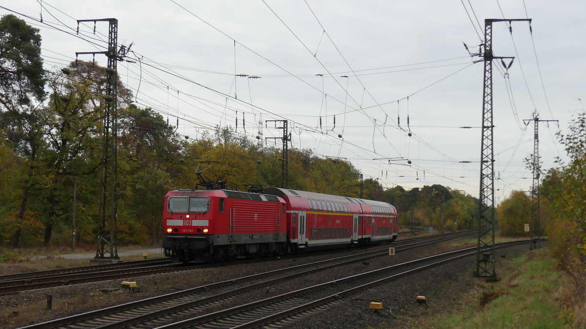 143 141 zieht eine RB75 nach Wiesbaden durch den Darmstädter Knoten und passiert hier gerade die Abzweigstelle Stockschneiße. Aufgenommen am 31.10.2018 15:45