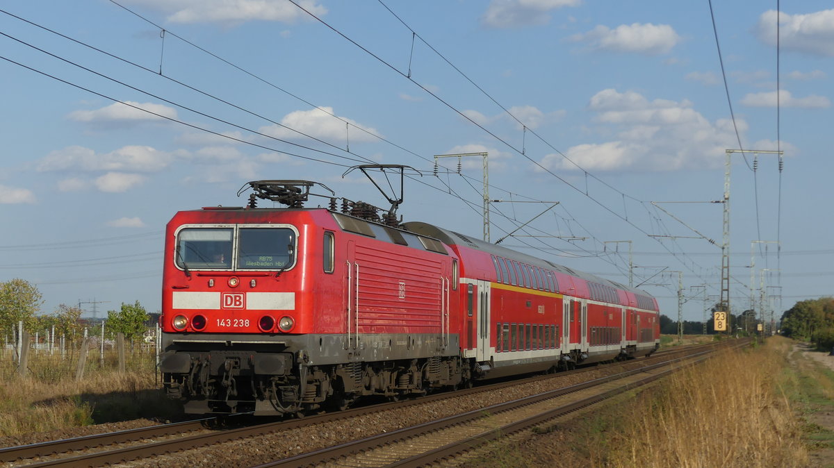 143 238 zieht eine RB75 nach Wiesbaden zwischen Weiterstadt und Klein-Gerau über die Rhein-Main Bahn. Aufgenommen am 19.9.2018 17:21