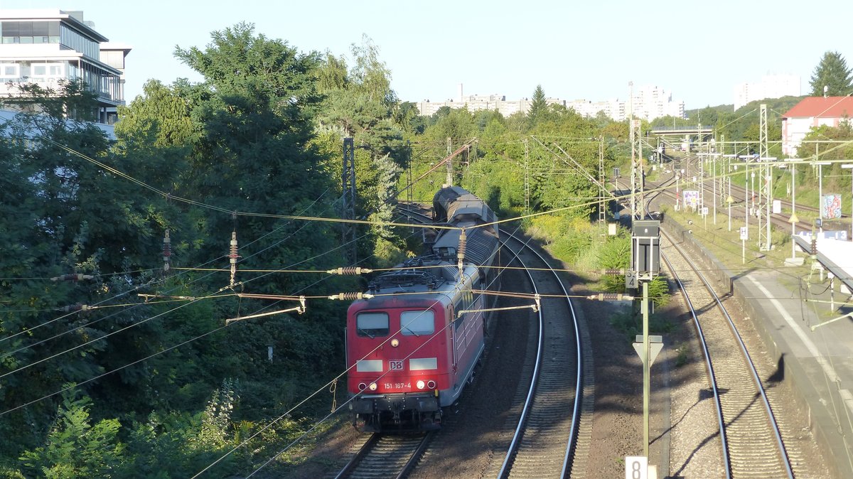 151 167 zieht einen Güterzug gen Westen am Bahnhof Darmstadt Nord vorbei. Aufgenommen am 30.8.2016 18:52
