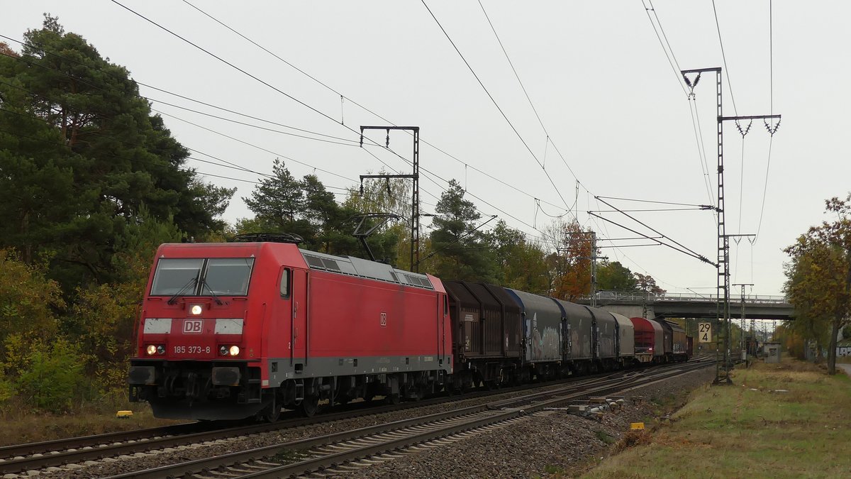 185 373 zieht einen Güterzug über die Rhein-Main Bahn gen Westen und verlässt gerade den Darmstädter Knoten. Aufgenommen am 31.10.2018 14:59