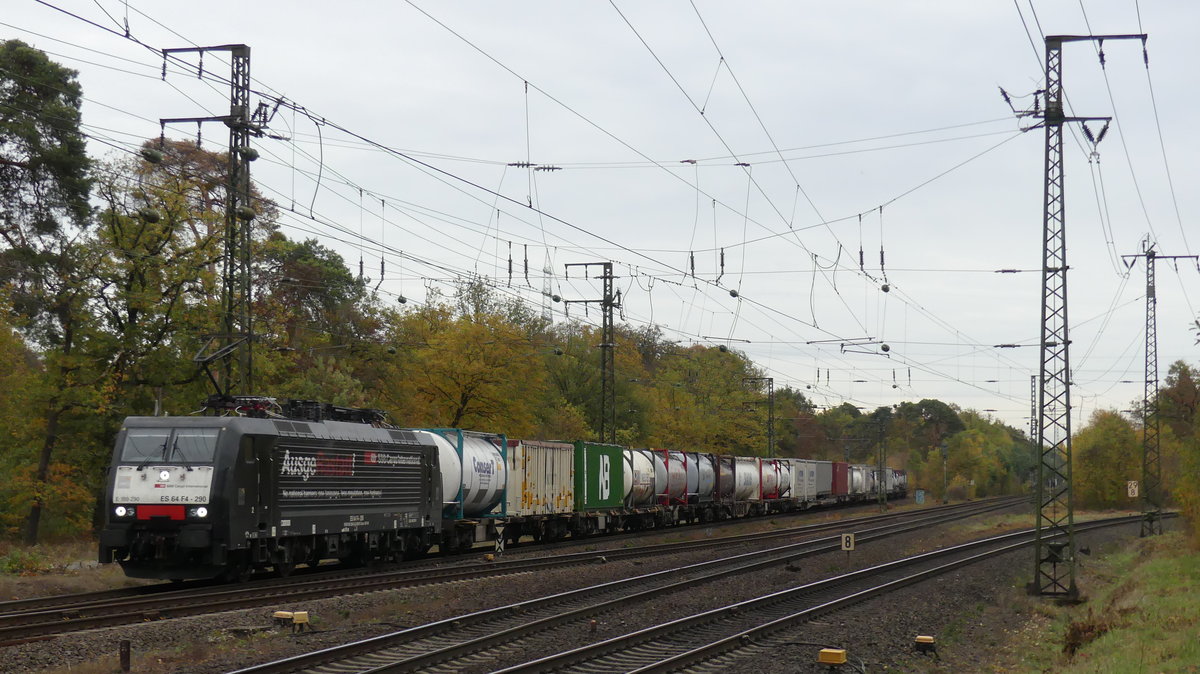 189 290 "AusgeRastatt" zieht einen Güterzug durch den Darmstädter Knoten. Der Zug kommt aus Richtung Mannheim und trifft hier gerade an der Abzweigstelle Stockschneiße auf die Rhein-Main Bahn, auf der es weiter gen Westen geht. Aufgenommen am 31.10.2018 15:49