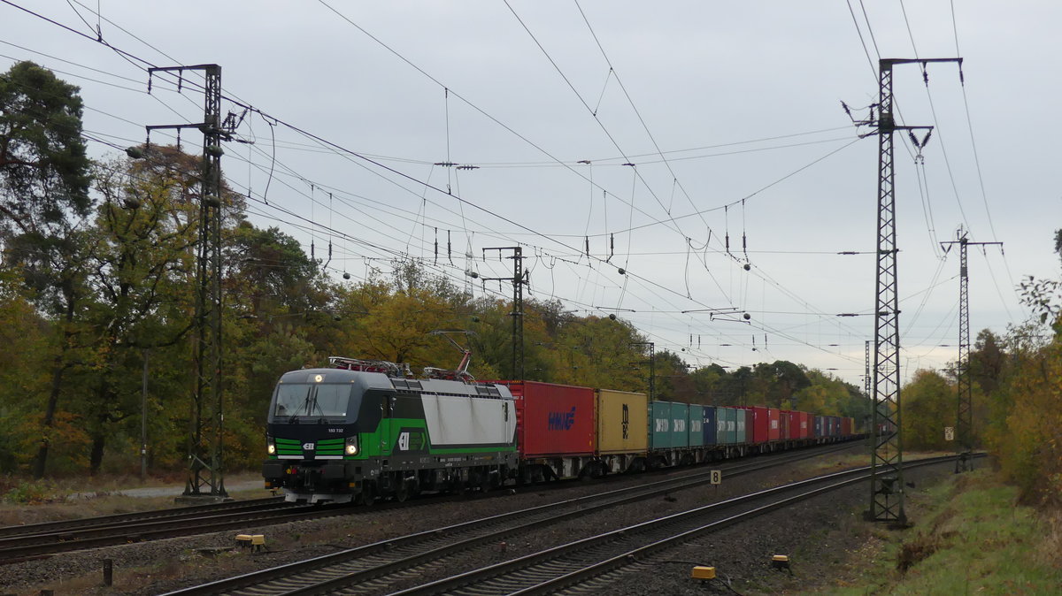 Eine ELL Vectron durchfährt den Darmstädter Knoten aus Aschaffenburg kommend in Richtung Weiterstadt und passiert hier gerade die Abzweigstelle Stockschneiße. Aufgenommen am 31.10.2018 16:58