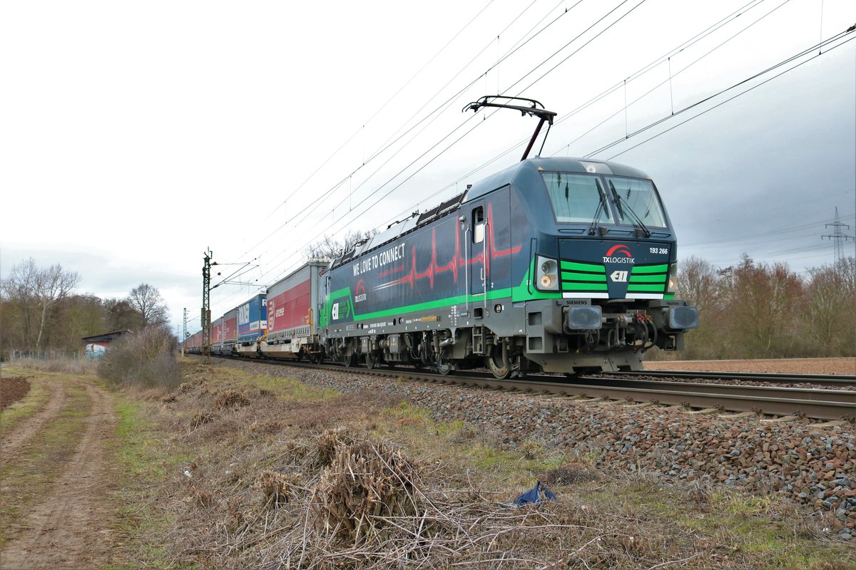 185 257 zieht einen Güterzug auf der Rhein-Main Bahn zwischen Weiterstadt und Klein-Gerau gen Westen. Aufgenommen am 22.4.2016 15:01