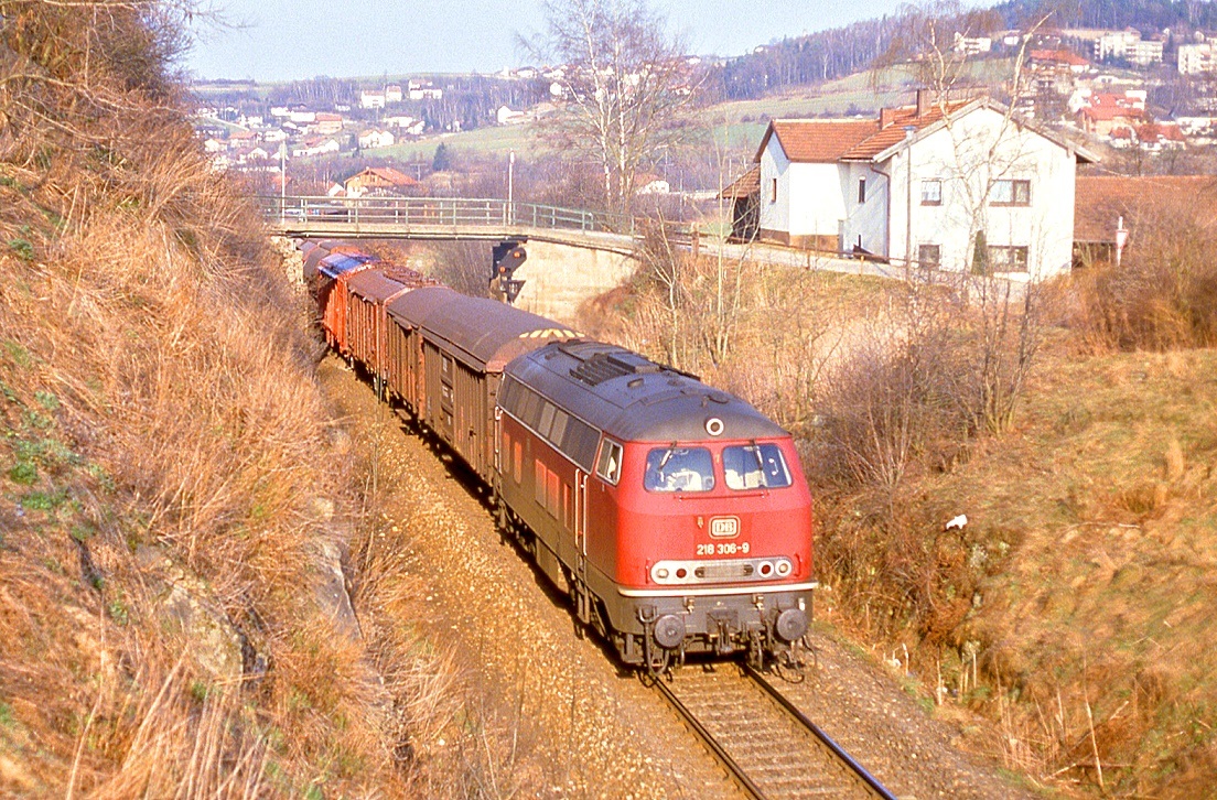 218 218 hat Furth im Wald verlassen und nähert sich der Staatsgrenze zur Tschechoslowakei, Zug 44123, 14.05.1988. 218 218 war Anfang 1974 Versuchslok der Bundesbahn für die neue ozeanblau-beige Lackierung.