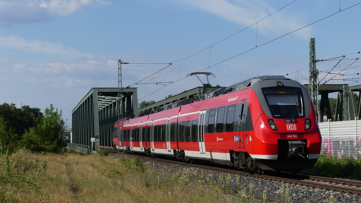 Auf der S2 Roth - Altdorf gibt es auch einen Umlauf mit 442-Triebwagen, der hier bei der Überquerung des Main-Donau Kanals zwischen den Stationen Nürnberg-Sandreuth und Nürnberg-Eibach zu sehen ist. Aufgenommen am 29.6.2018 17:50