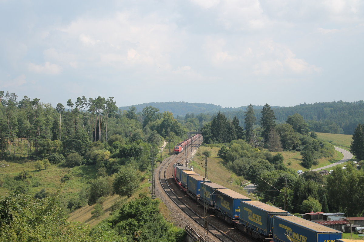 Begegnung zweier Güterzüge bei Möhren am 19.08.2016. Der Walterzug fährt in Richtung Norden (Treuchtlingen). Der schwere Kohleganzug in Richtung Süden. Die Besonderheit des Kohlezuges ist, dass er vorne als Zuglok eine 152 und hinten auch eine schiebende Baureihe 152 am Zug hat.