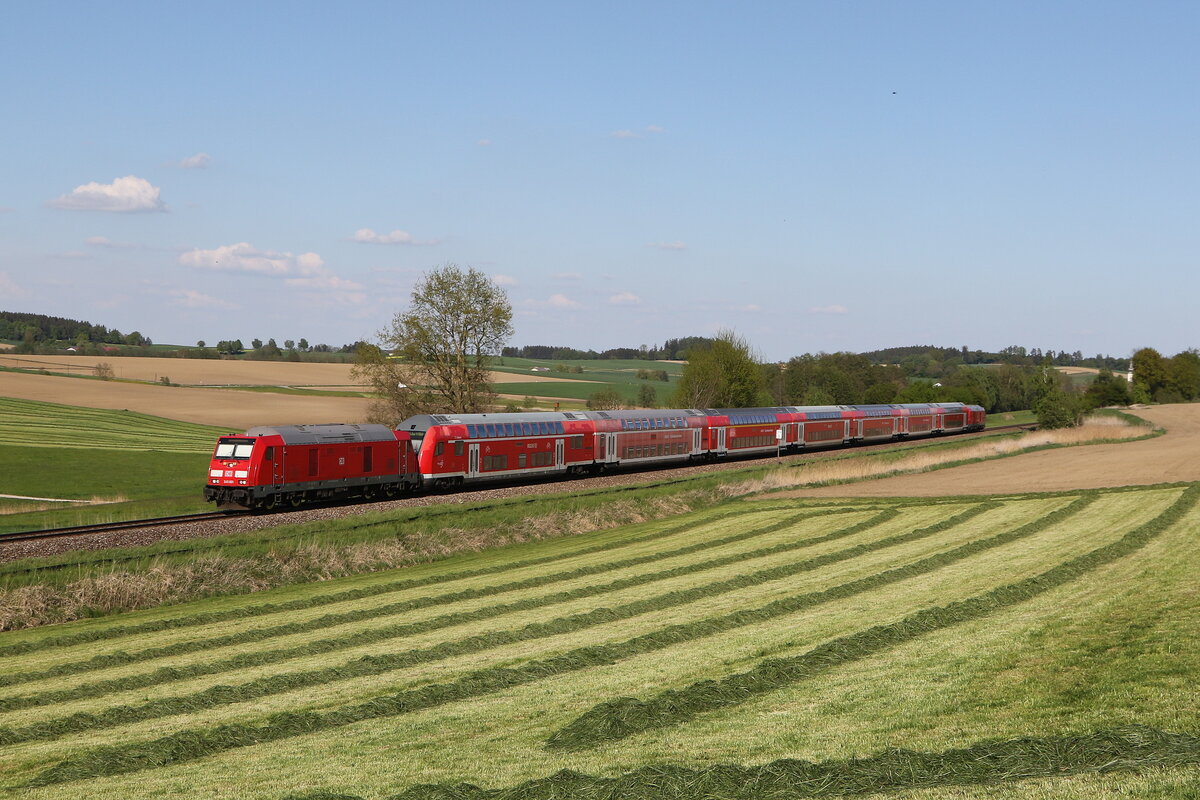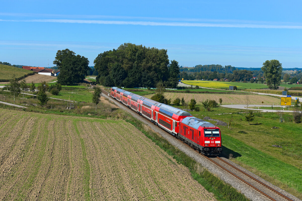 Die vermehrten Einsätze der Baureihe 218 auf der KBS 940 sind inzwischen wieder Geschichte. Nach den erfolgten Hauptuntersuchungen stehen wieder genug Bombardier Traxx-Maschinen für die Beförderung der Doppelstockzüge zur Verfügung. Beispielhaft hier ein Bild vom 29. September 2023, das die 245 003 vor der RB 27027 auf der Fahrt nach Mühldorf bei Thalham in Oberbayern zeigt.