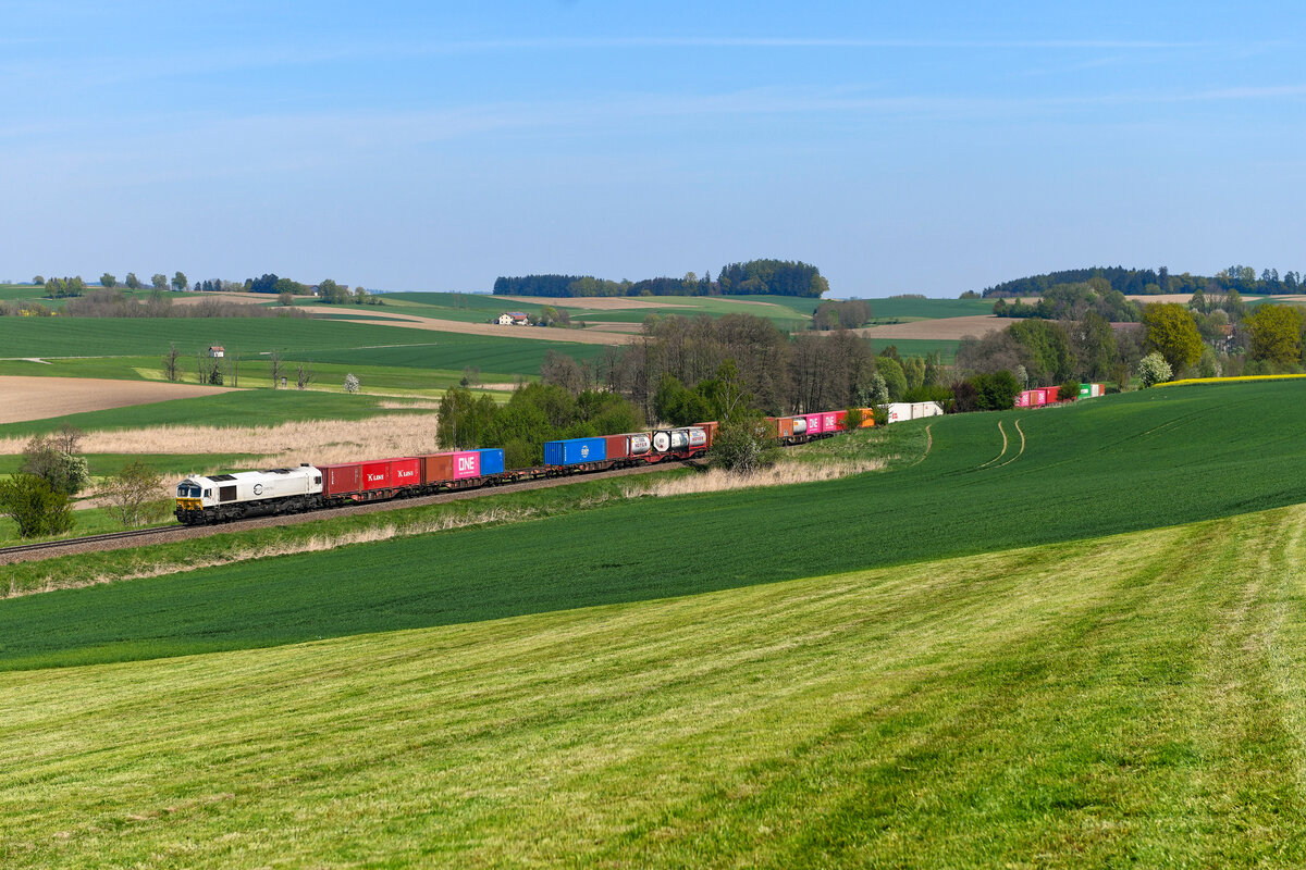 Am 13. April 2024 machte ich noch einen kurzen Abstecher ins "Dieselparadies". Der samstägliche Containerzug KT 60886 von Burghausen Wackerwerk nach München Nord stand auf dem Programm. Wenige Minuten nach Ankunft in Niedergeislbach erschien auch schon die 077 013 mit der gut beladenen Leistung auf der Bildfläche. Anscheinend wurde die Traktionierung wieder von EuroDual auf Class 66/77 umgestellt.