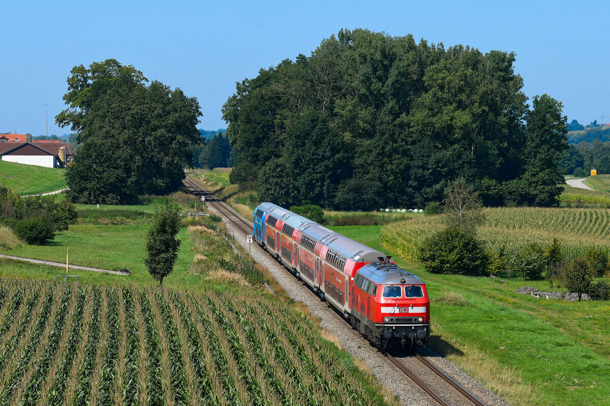 Die 218 401 bespannte am 29. August 2024 die RB 27027 von München HBF nach Mühldorf. Zwischen Schwindegg und Weidenbach konnte ich den Doppelstockzug aufnehmen.