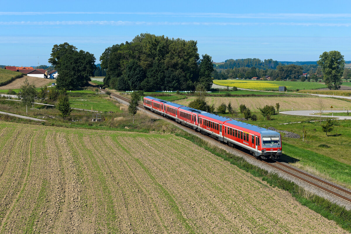 Die RB 27038 von Mühldorf am Inn nach München HBF wird planmäßig aus einer Dreifach-Garnitur der Triebwagen-Baureihe 628 gebildet. Am 29. September 2023 konnte ich diese bei der Fahrt in die bayerische Landeshauptstadt bei Thalham fotografieren. Den Schluss bildete der 628 668, der lange in Nordrhein-Westfalen aktiv war und erst seit 2019 zum Bestand der Südostbayernbahn zählt.