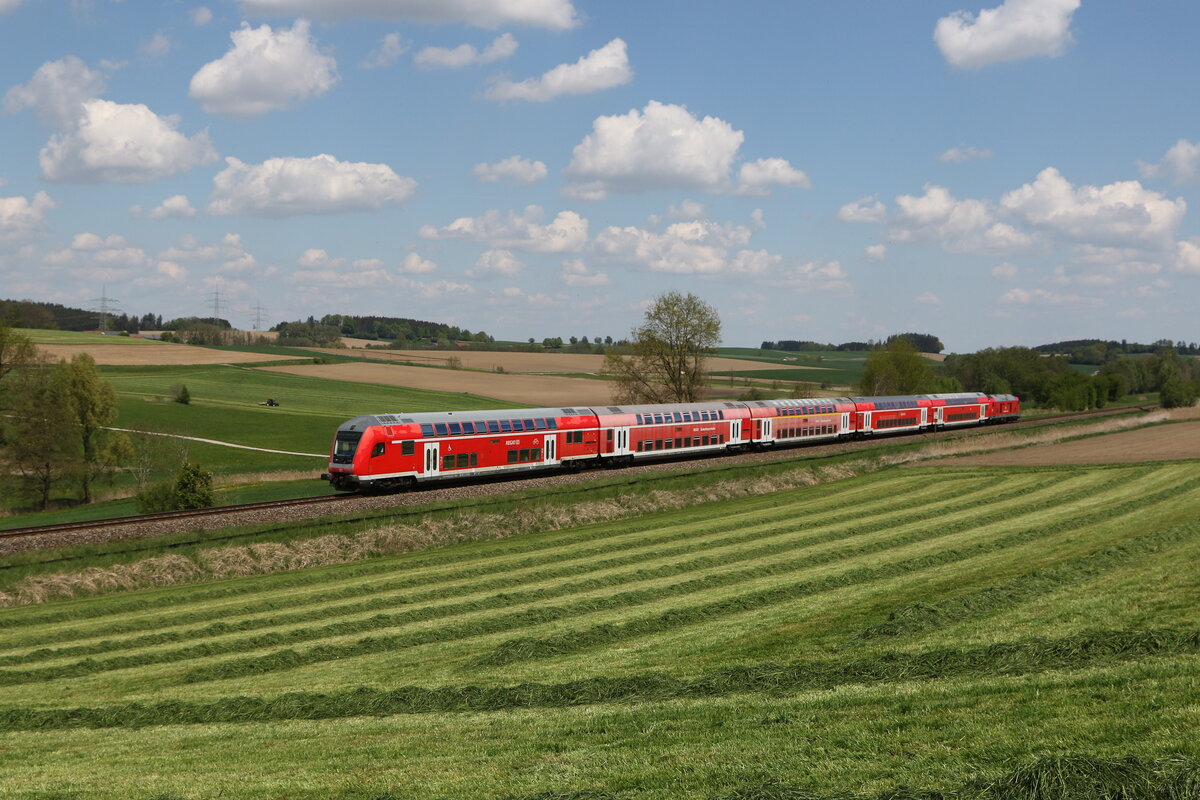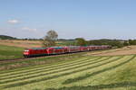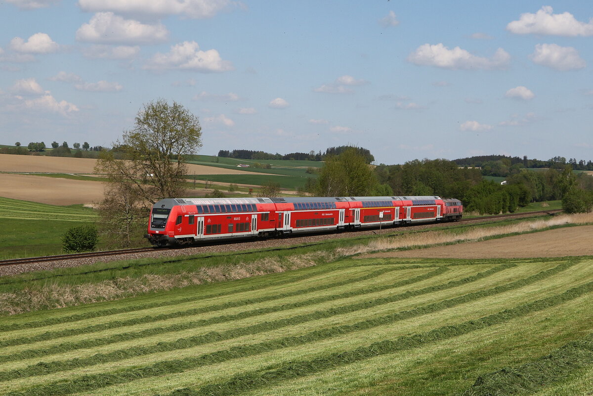 Nach einer kurzen Wende in Mühldorf schob 218 401 ihren Doppelstockzug als RB 27040 zurück nach München. Bei Weidenbach konnte ich die Leistung, für die normalerweise eine Lok der Baureihe 245 eingeteilt ist, aufnehmen (29. August 2024).