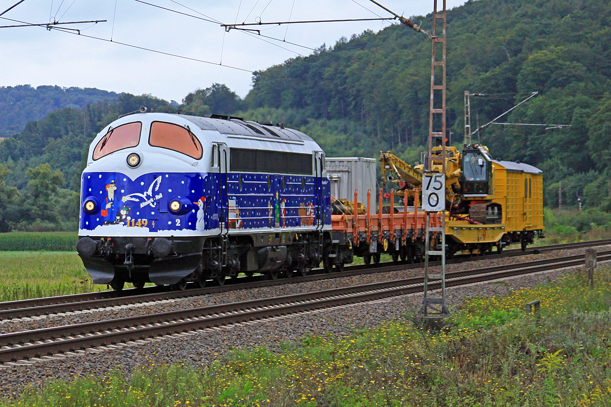 Am 29.04.2022 war die Weihnachtslok von Altmark Rail 1149 zu Gast im Bahnhof Hasbergen und stand dort in der Mittagszeit vor einem Bauzug in Richtung Osnabrück.