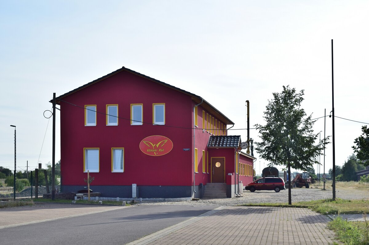 Blick auf das Büro und Übernachtungsgebäude der Altmark Rail. Dies wurde 2018 umgebaut und beinhaltet auch 4 Zimmer für Übernachtungen als Pension. Man beachte zudem das Firmenfahrzeug rechts neben dem Gebäude.